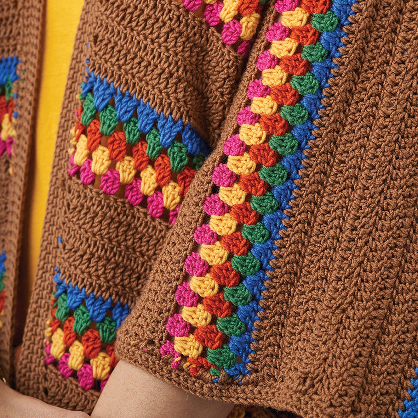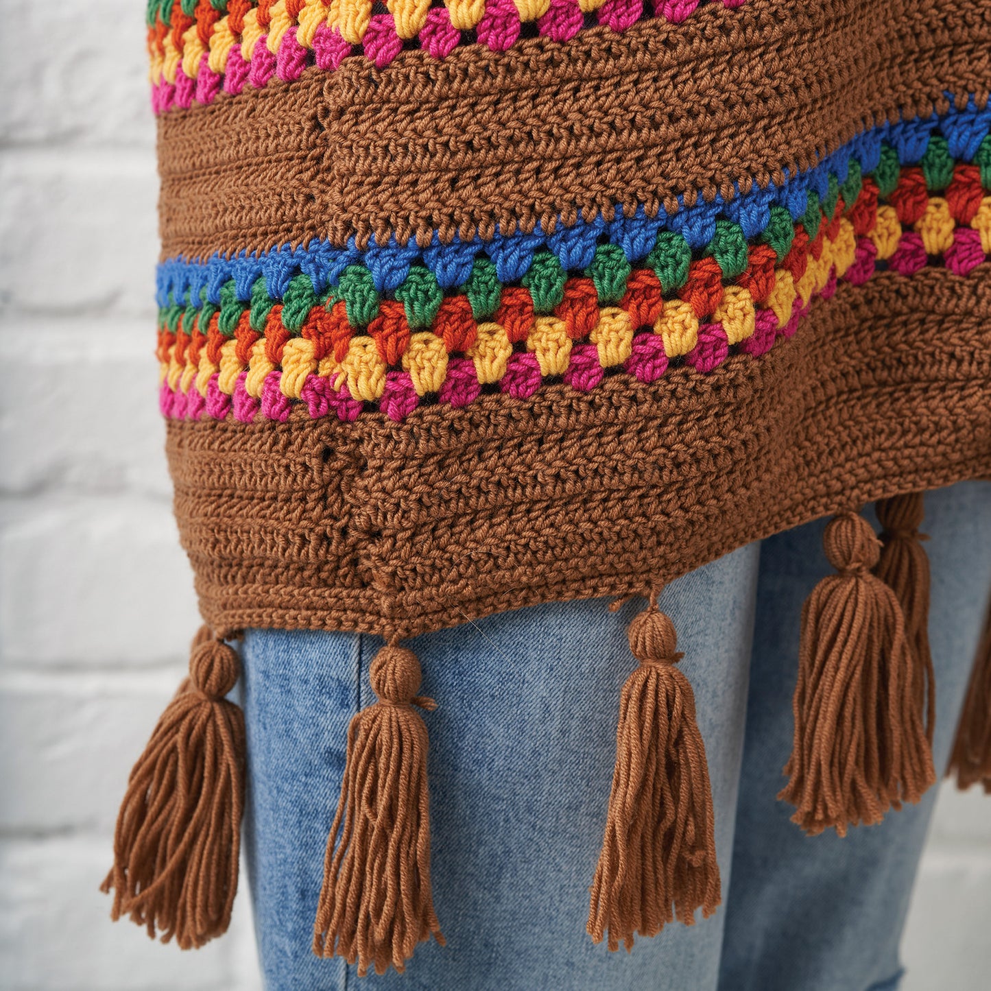 Person wearing a brown crochet poncho with colorful patterns against a white brick wall.
