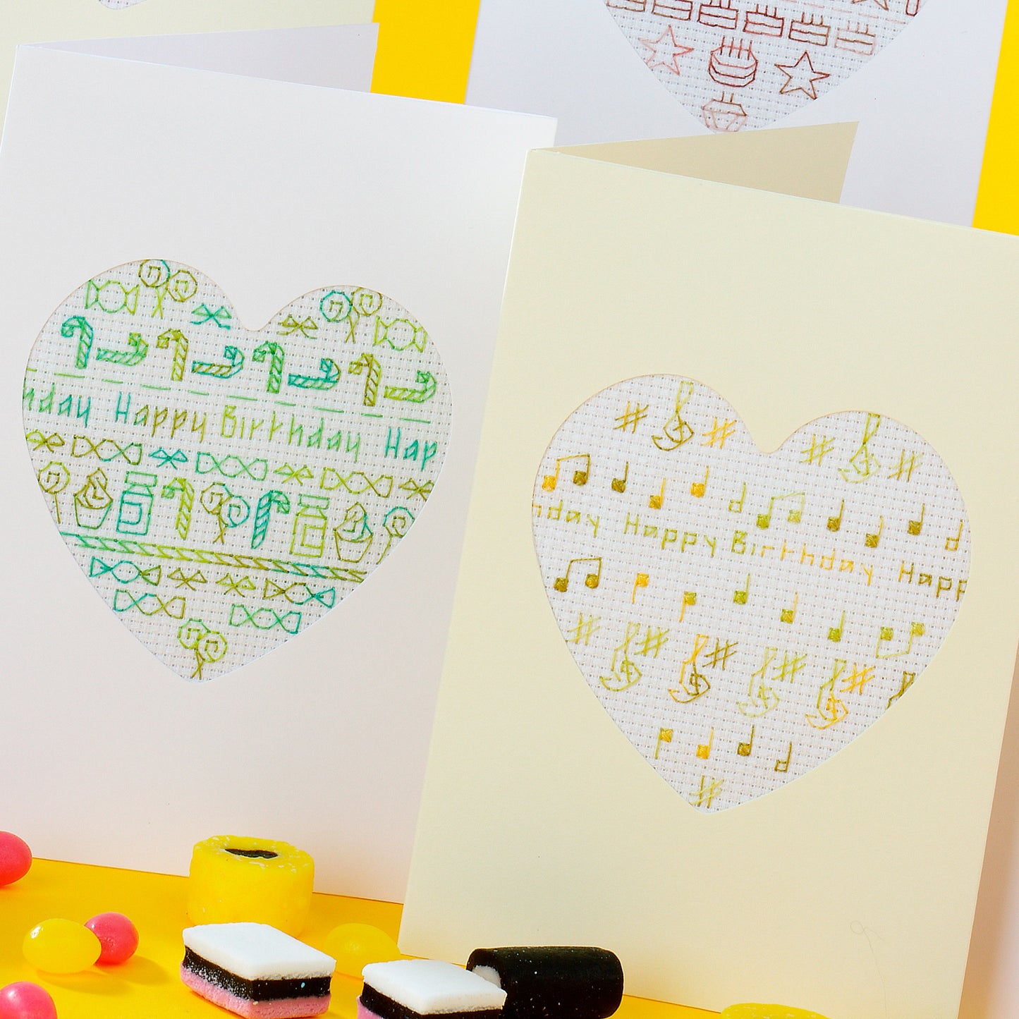 Stitch and send happy birthday wishes with colourful mini heart cross stitch samplers – they’re super-quick to make using our included heart template to create your own shaped aperture cards.