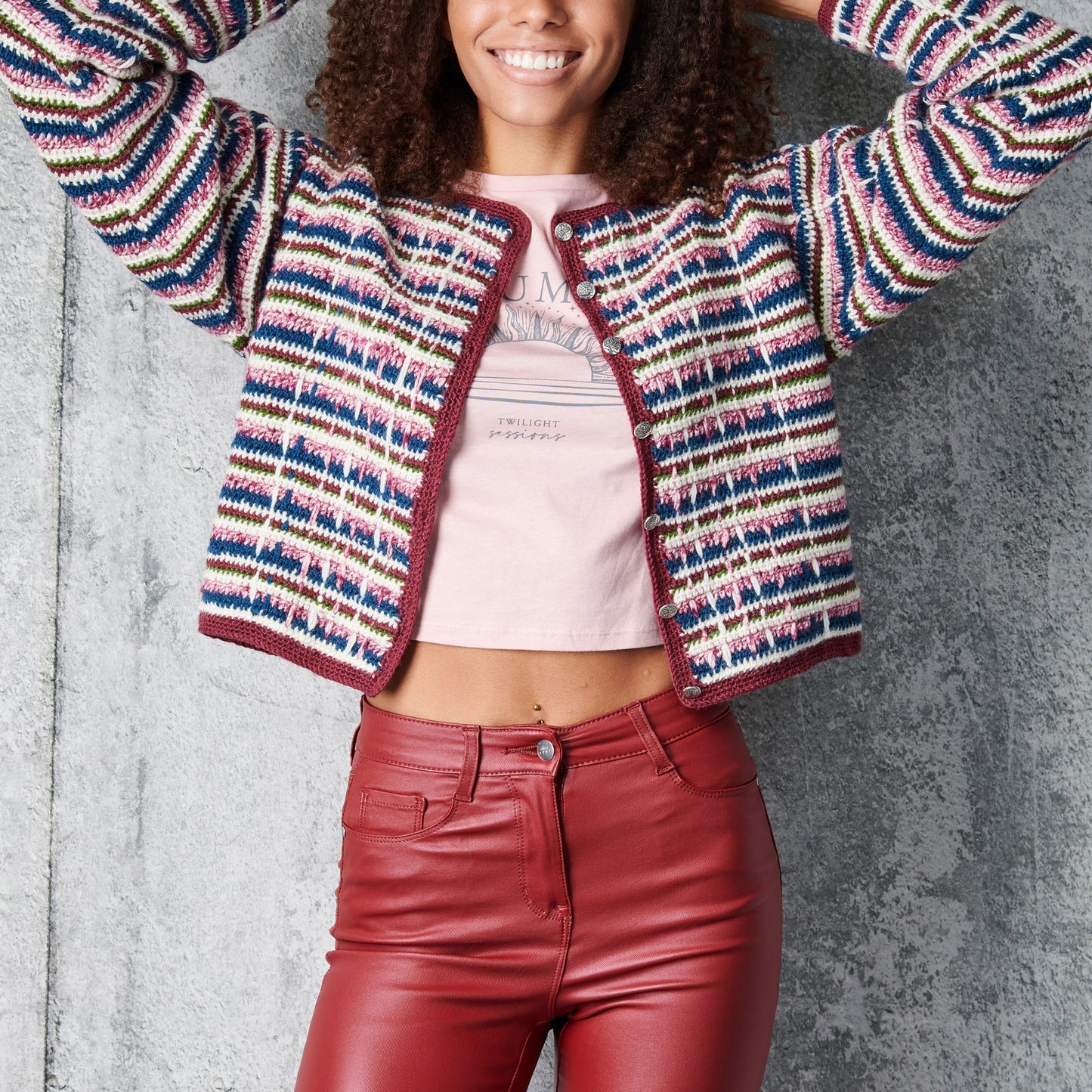 Two colorful crochet cardigans worn by different models, one with a patterned design and the other with a multicolor pattern.