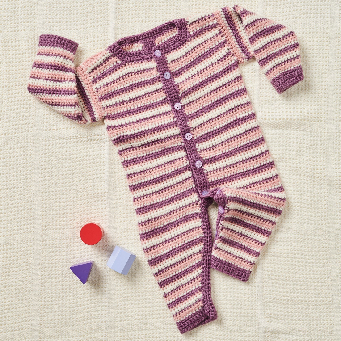 Striped baby romper with buttons on a textured surface