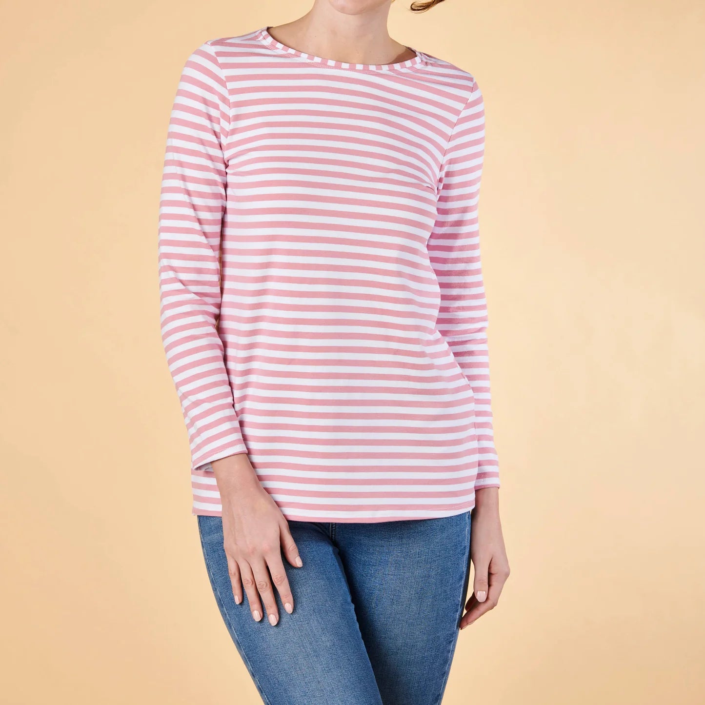 Person wearing a pink and white striped long-sleeve shirt against a beige background