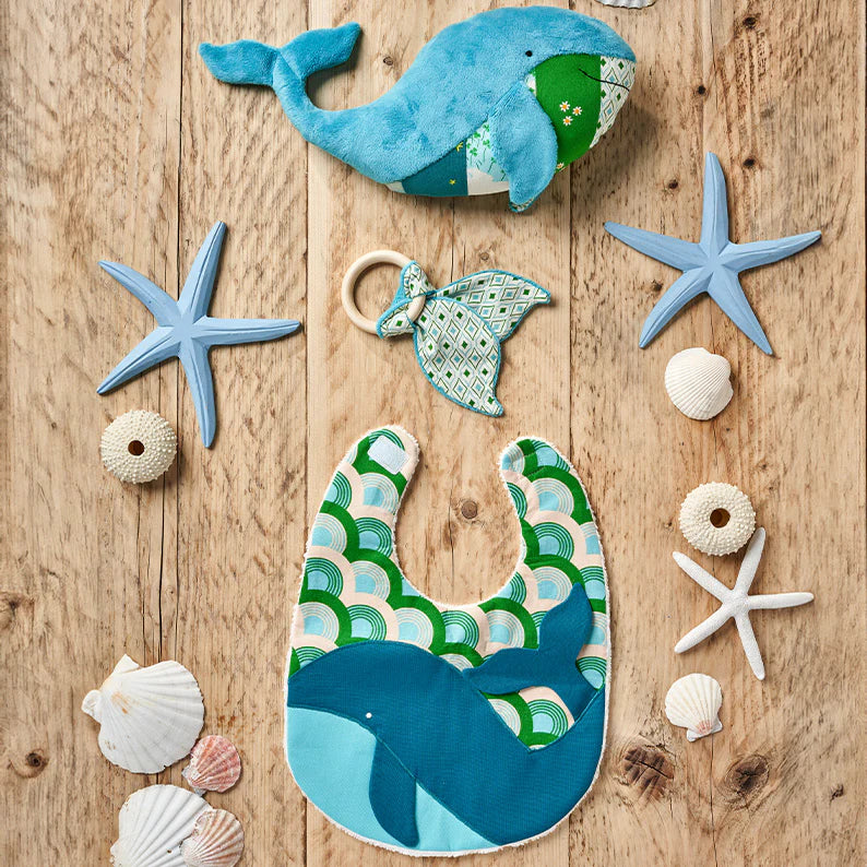 Baby bib, teether, and toy with whale design on a wooden surface with starfish and shells.