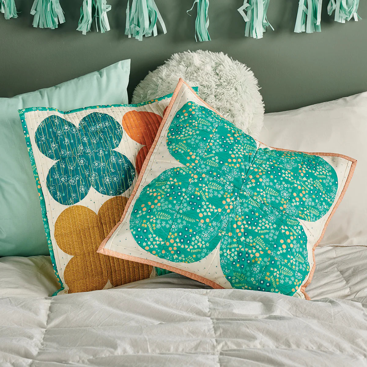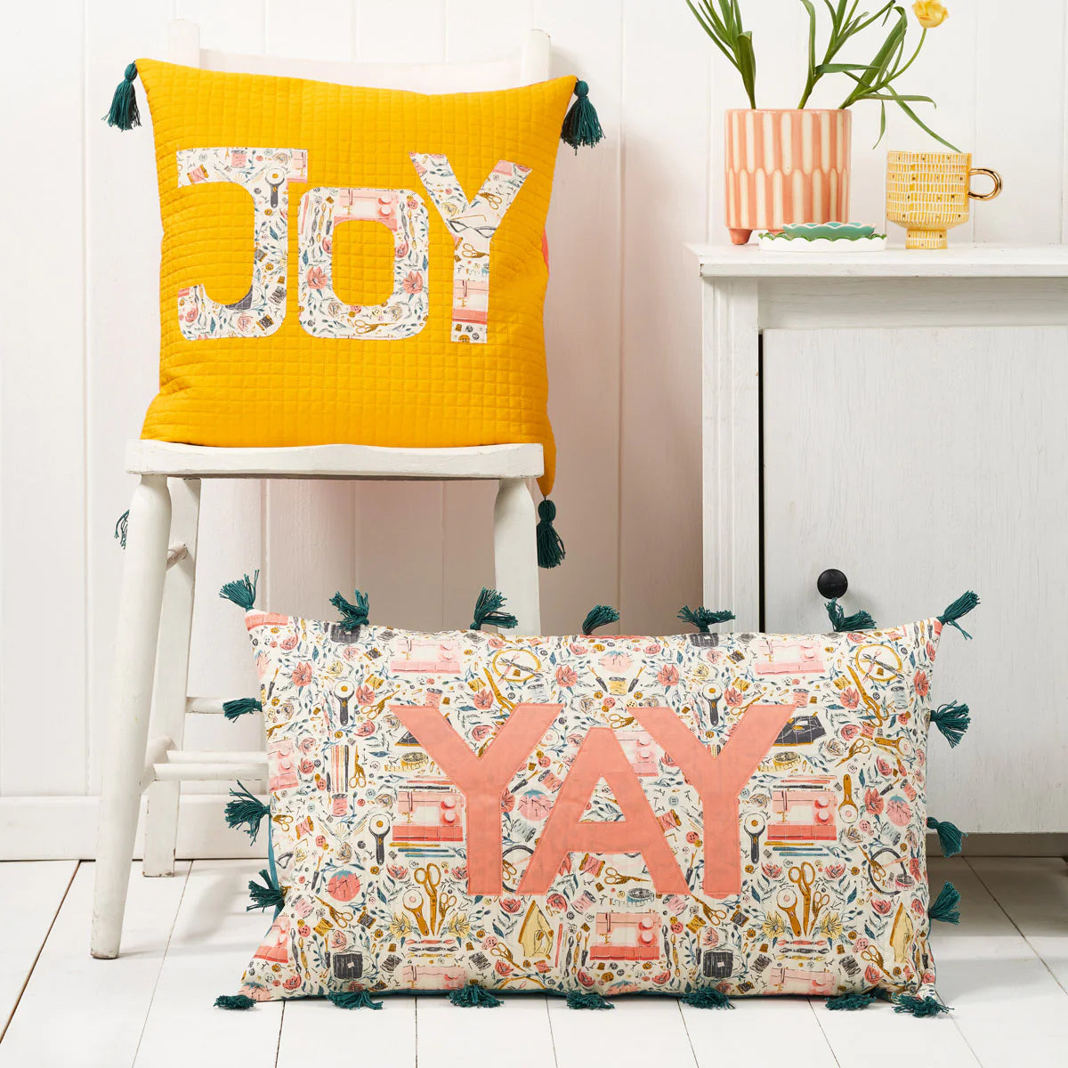 Stitch this beautifully bright collection of cushions to light up your space. In the set, you'll find a retro blooms design featuring Drunkard’s Path blocks sewn in mid-century shades, a cute cushion pair with easy appliqué lettering, and a pompom-topped pair of kitsch Christmas cushions.