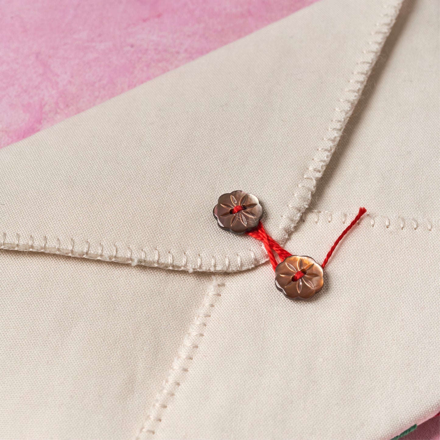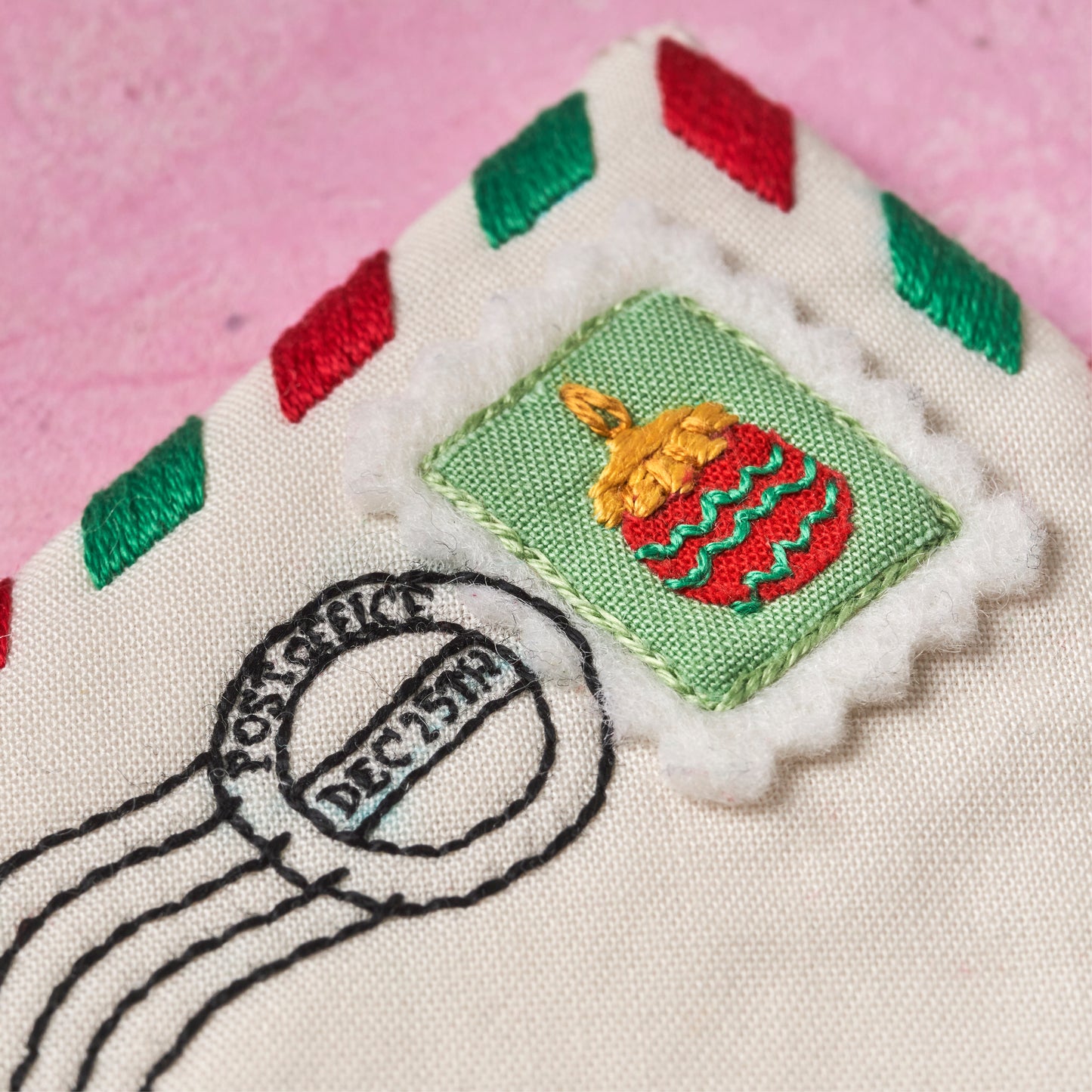 Featuring lots of thoughtful embroidered details – from stamp marks to an air-mail-inspired Christmas border – plus a cute button fastening, this sweet, seasonal make by Clare Albans is as fun to stitch as it is to behold.