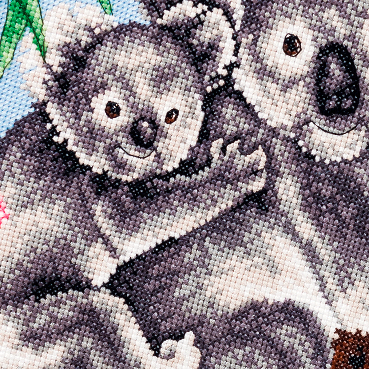 Brighten your home by stitching the friendly faces and furry coats of this cuddly koala duo, featuring a cute mother and baby hanging in a tree.