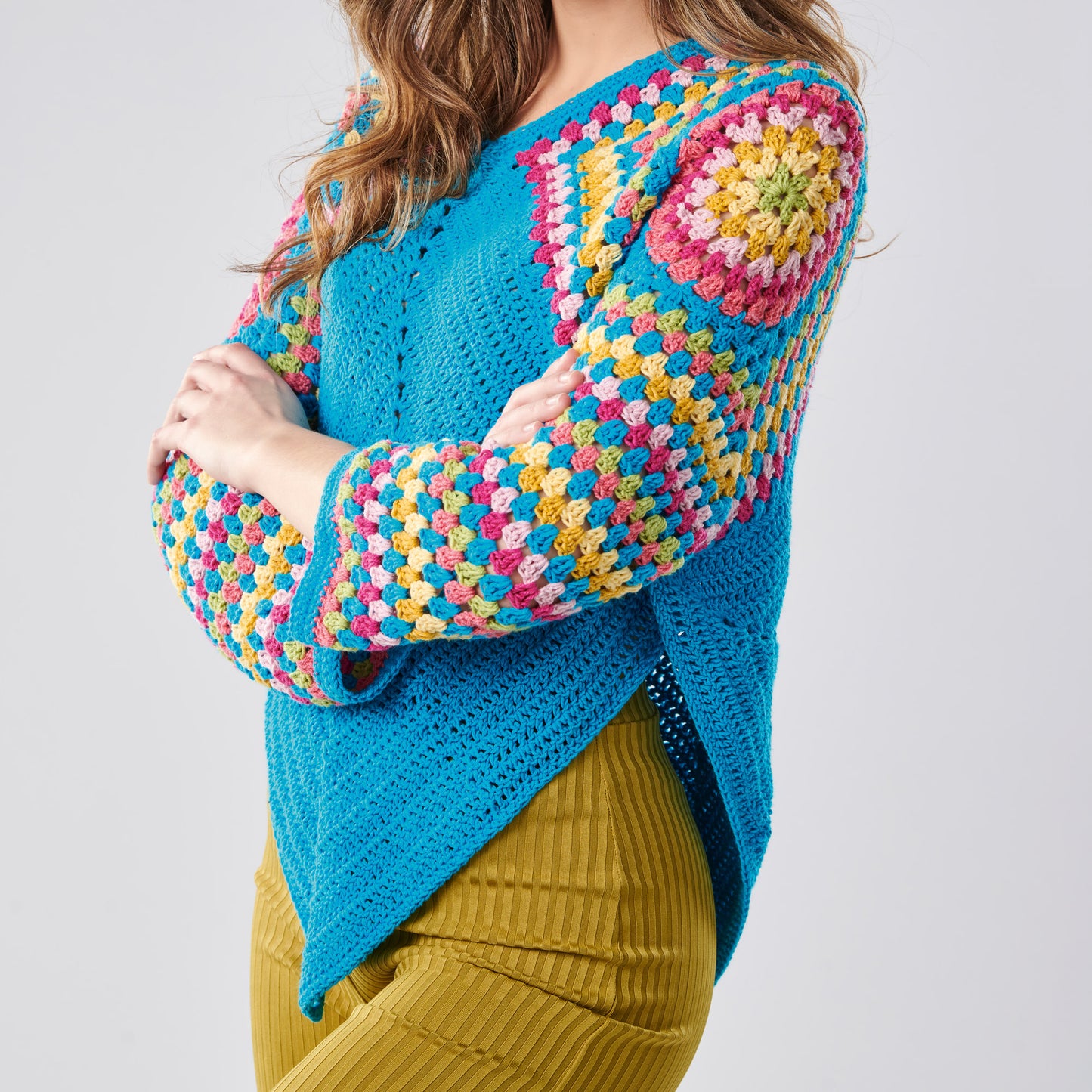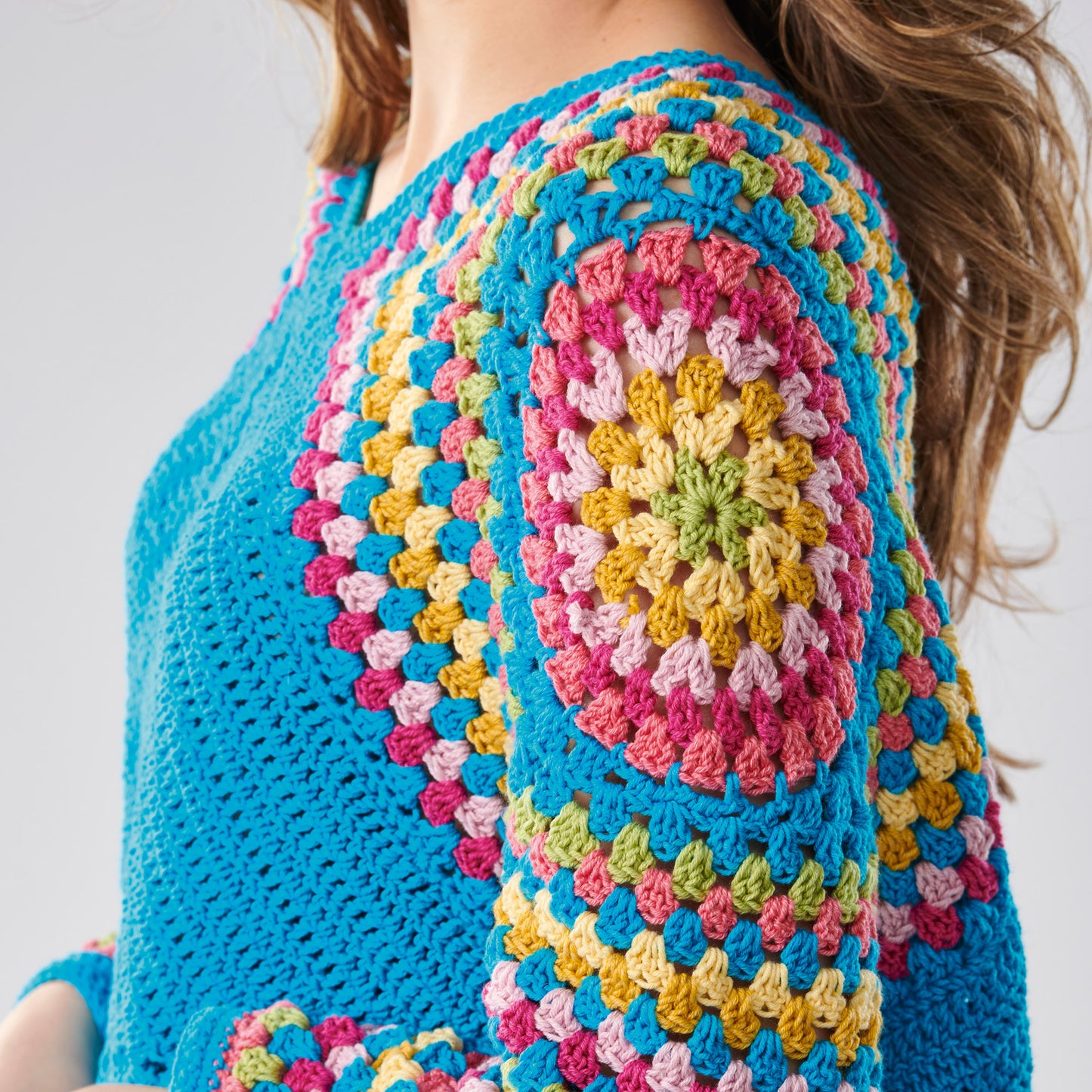 Woman wearing a colorful crochet sweater with a blue center on a light gray background