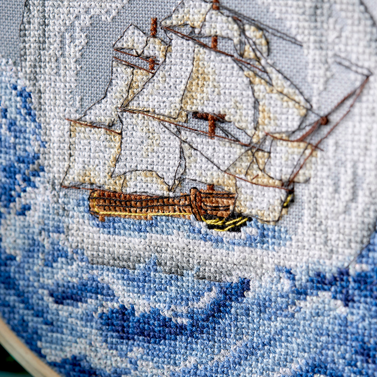 Set sail on a voyage of discovery as you master your craft to bring this dramatic ship in a bottle picture to life in cross stitch. This stunning design is shown stitched on special "Stormy Night" Fabric Flair patterned material, available from worldwide suppliers. Fits perfectly in a 5x9in oval embroidery hoop, or make into a framed picture, hanging, canvas or more!