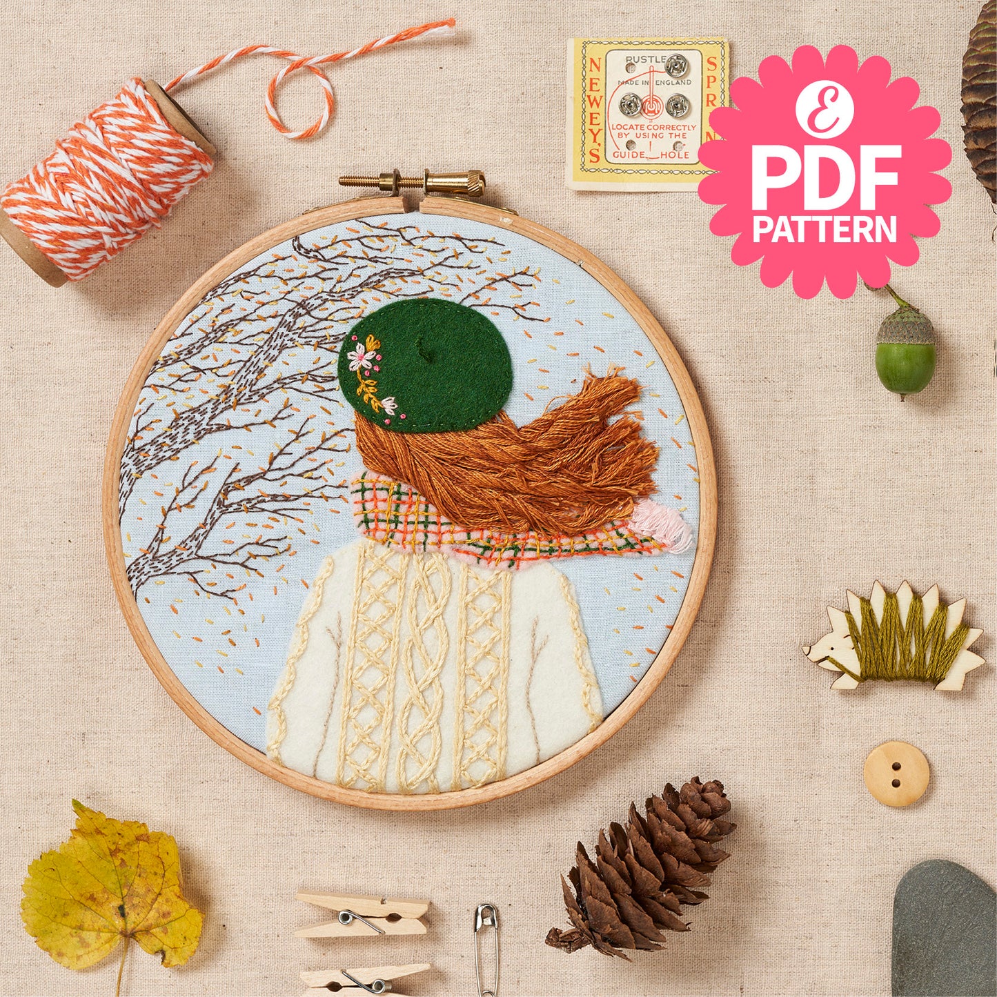 There’s nothing quite like the feeling of a crisp fall morning, enjoyed from the warmth of your fave pullover, is there? Capture that serenity in stitches using faux cables – made with a little help from a variation on the classic Chain Stitch – three-dimensional locks caught in the breeze, and a sweet felt beret to top it all off!