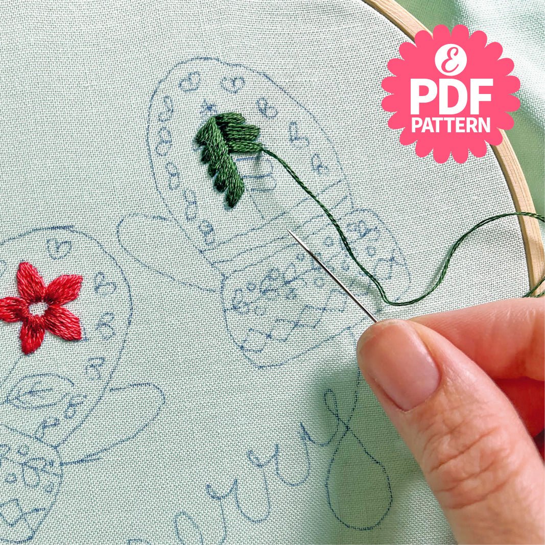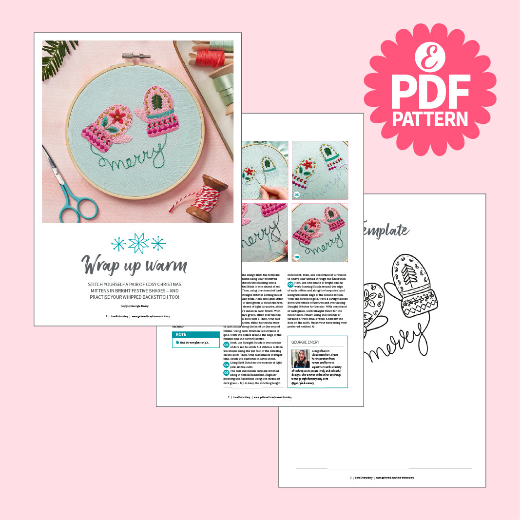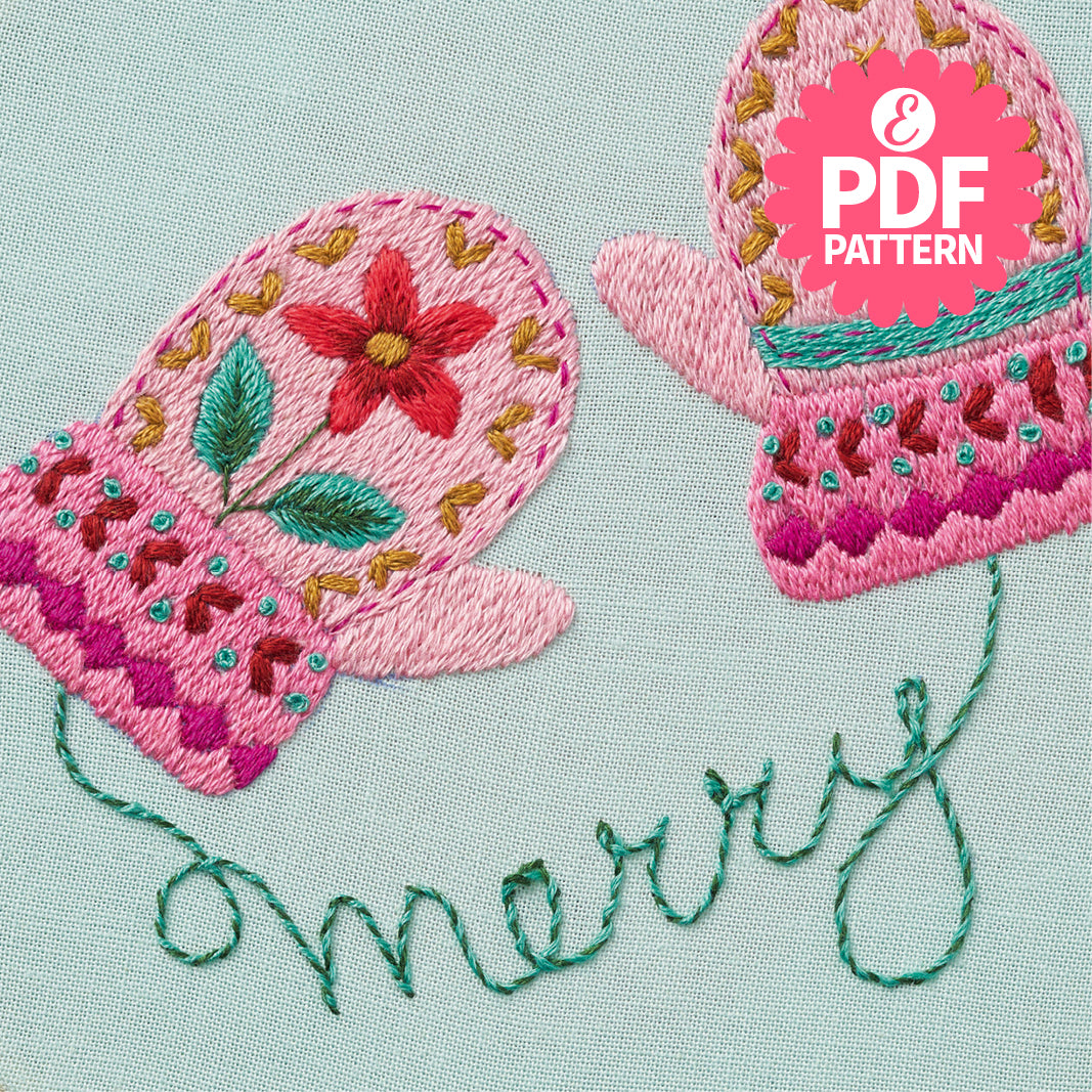 Sew yourself a pair of cosy Christmas mittens in bright festive shades – and practise your Whipped Backstitch as you go. Finished with the word 'merry' this is a fun project for beginners who are looking to expand their embroidery repertoire with French Knots, Split Stitch and more.
