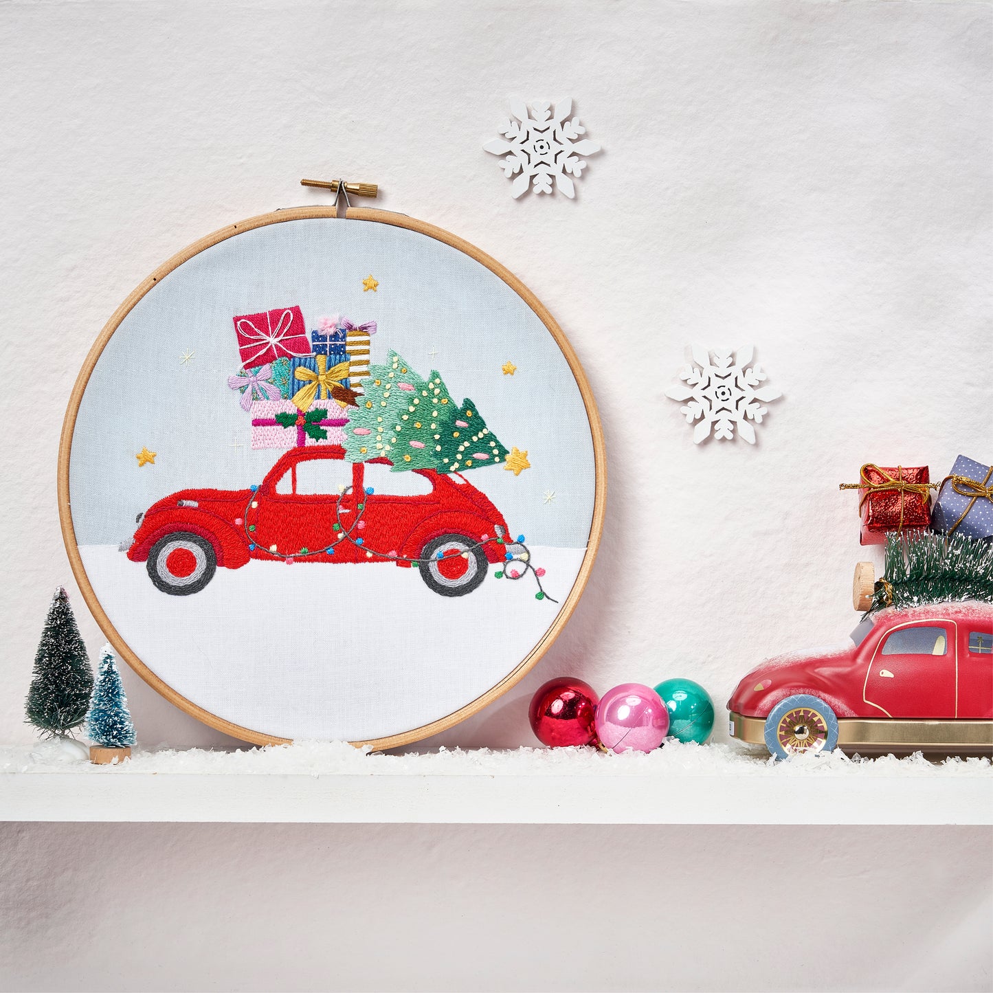 There’s nothing quite like the excitement of being in a gift-packed car with the Christmas tunes blasting, as you head home for the holidays, and now, you can capture that magical feeling in stitches with this nostalgic hoop. Teeming with charming details such as colourful presents, bright fairy lights, and a perfectly decorated Christmas tree, all perched atop a classic ruby-red car, you’ll work 10 stitches in a modern festive thread palette to bring this heartwarming holidays scene to life.