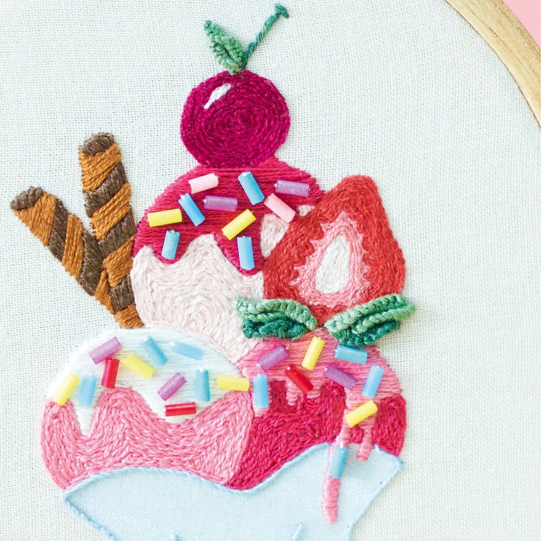 Whip up a delicious summer sundae served in a shimmering organza glass and topped with bugle bead sprinkles! – and learn 8 new embroidery stitches as you work!