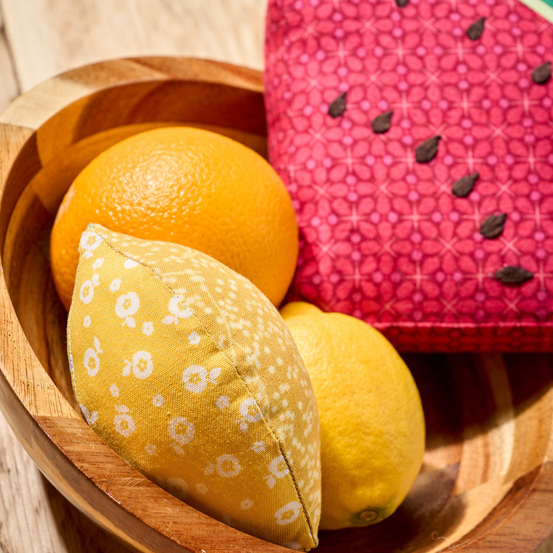 Sew a summery thirst-quenching slice of watermelon and a lemon perfect for fresh lemonade. The lemon is made up of four segments, each using a different yellow print fabric. Make it from green prints instead to create a lime! The watermelon slice uses curved seams and features embroidered seeds.