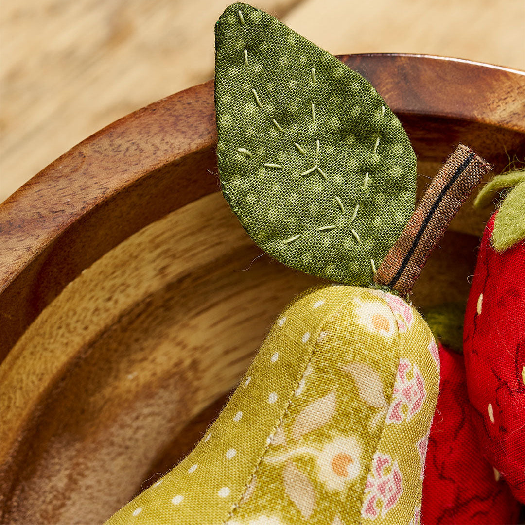 Nothing beats a punnet of juicy strawberries and the sweetest ripe pear! These strawberries are very easy to make and you can add a stalk, calyx and a leaf, in a choice of two sizes. The pear pattern uses chartreuse-coloured fabrics, but you could select darker greens to mimic a Conference pear or choose fabrics with pinkish tones for a Comice pear.