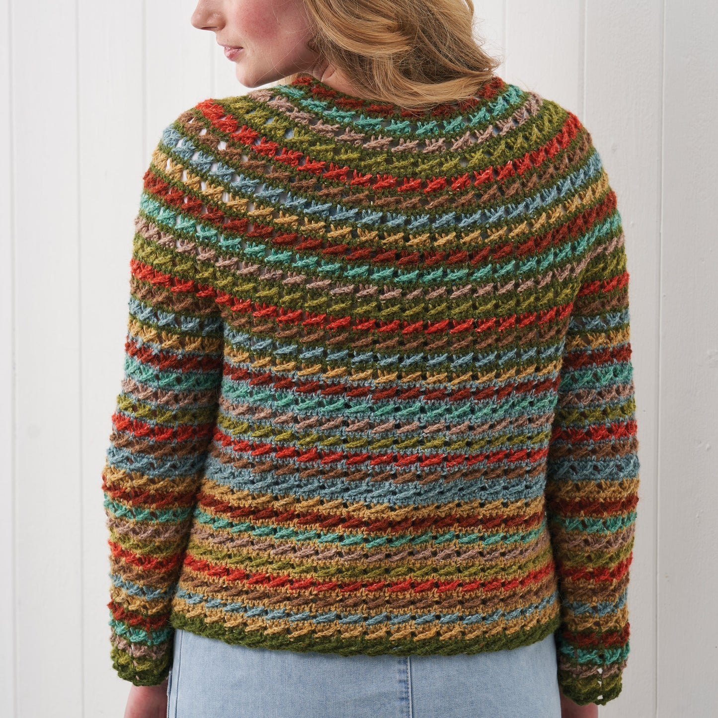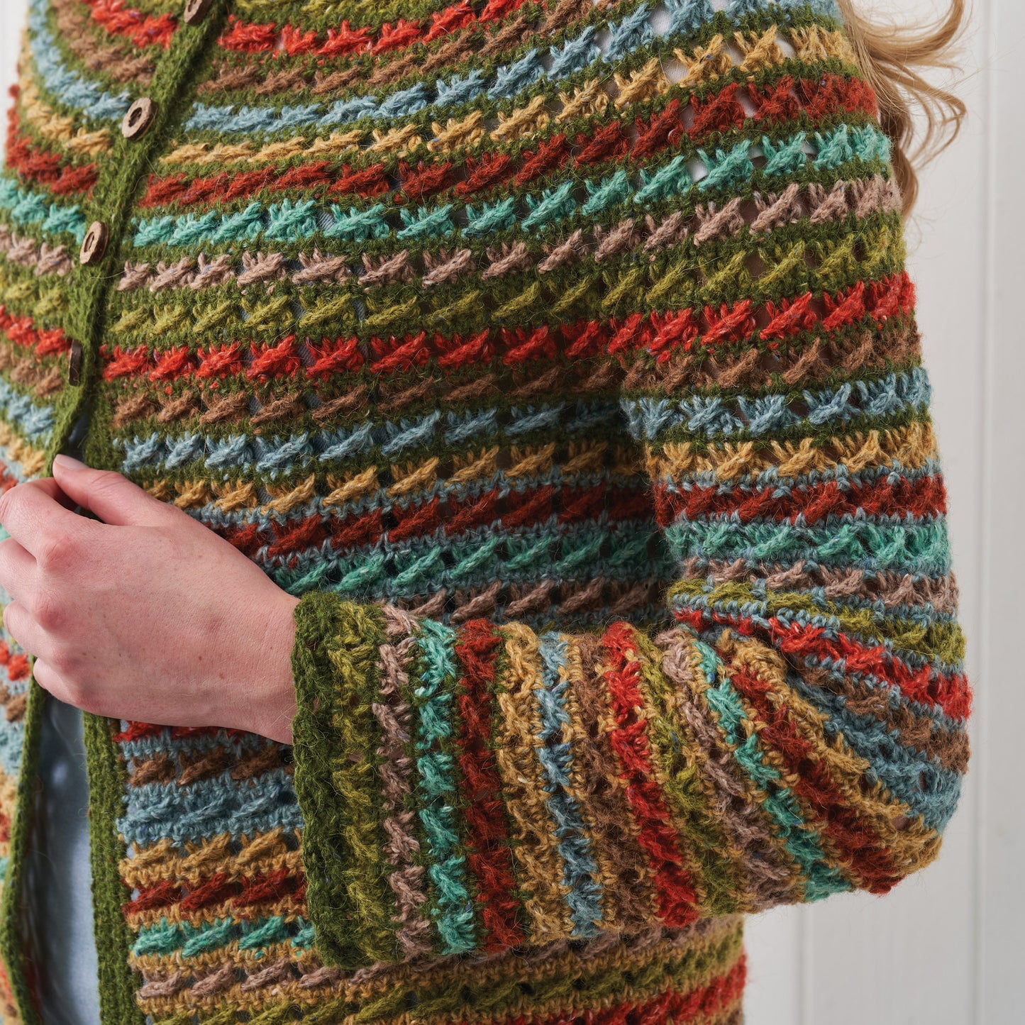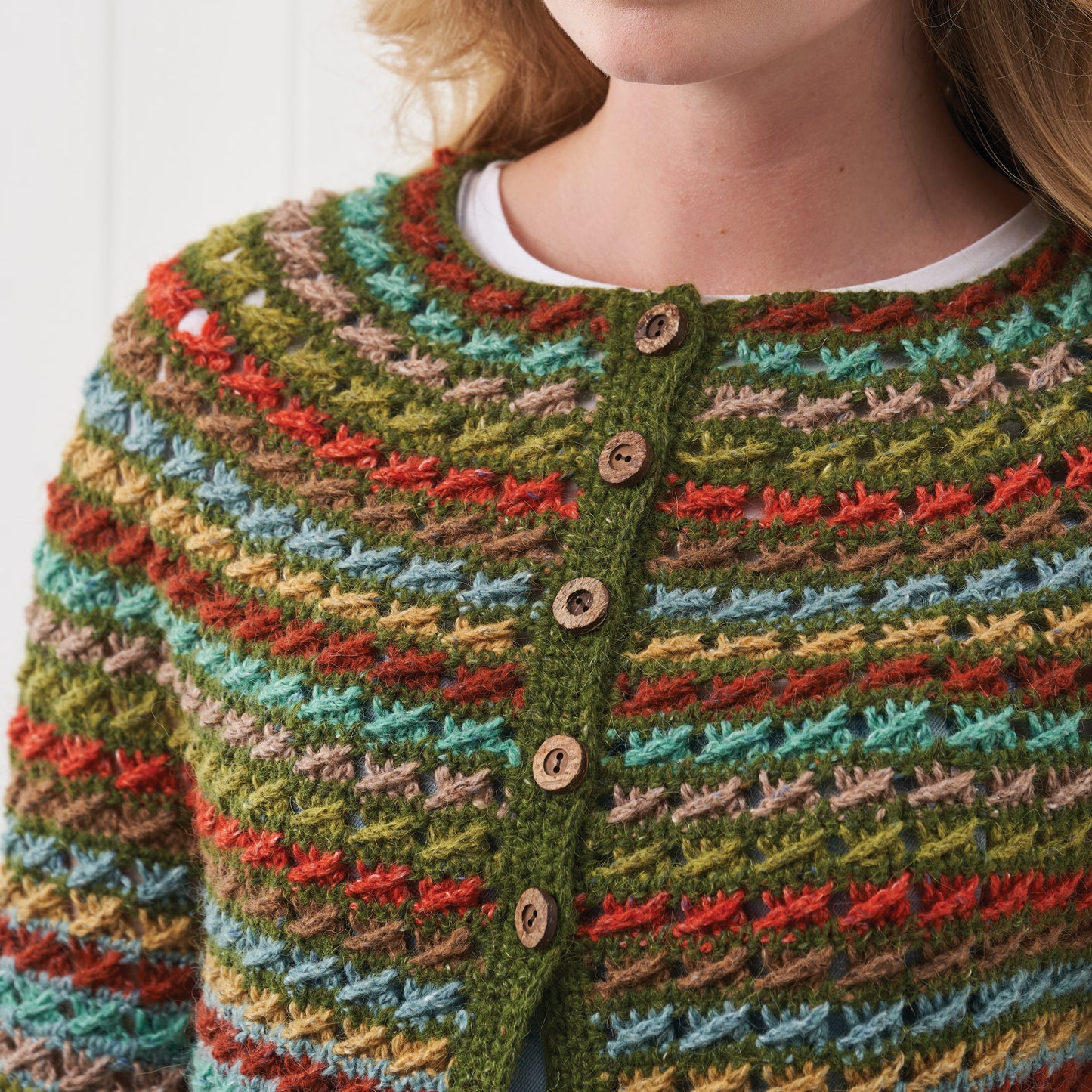 Pat has created a classic crochet cardigan pattern that's suitable for all ages! This beautiful cardi is evocative of verdant rural views and is perfect to keep you cosy with the high-button feature.