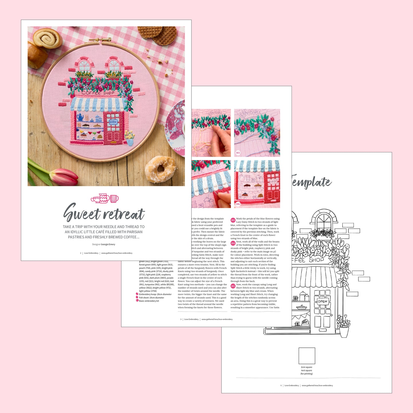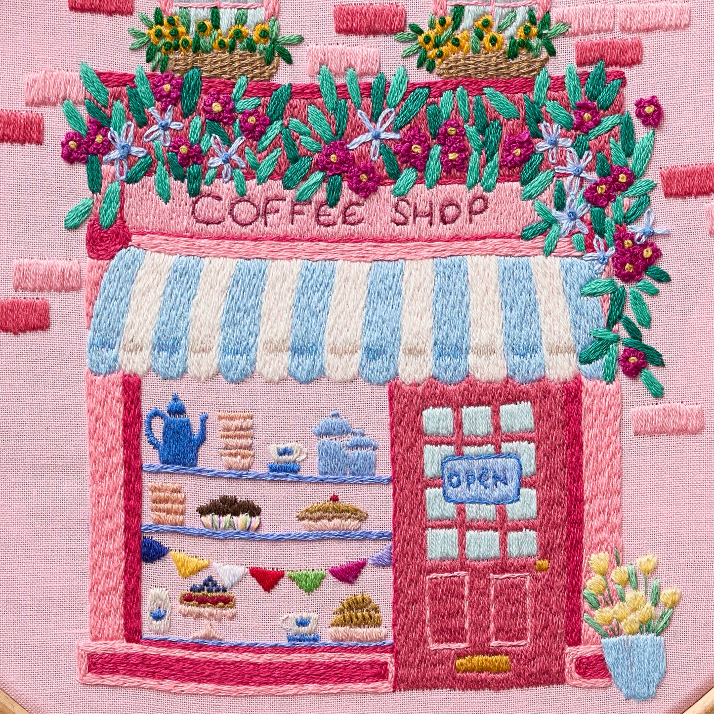 This pretty design features 8 different stitches making it ideal for those who are looking for a more challenging design to stitch after completing some of Georgie Emery's beginner-friendly designs in the Gathered Shop. It's packed with delicious details for you to work – think croissants, coffee pots, bunting, window boxes, flower displays, layered cakes, and more – and is worked on dreamy pink fabric for a romantic finish, although we reckon it would also look great stitched onto baby blue, mint green or pale yellow, too. Enjoy!