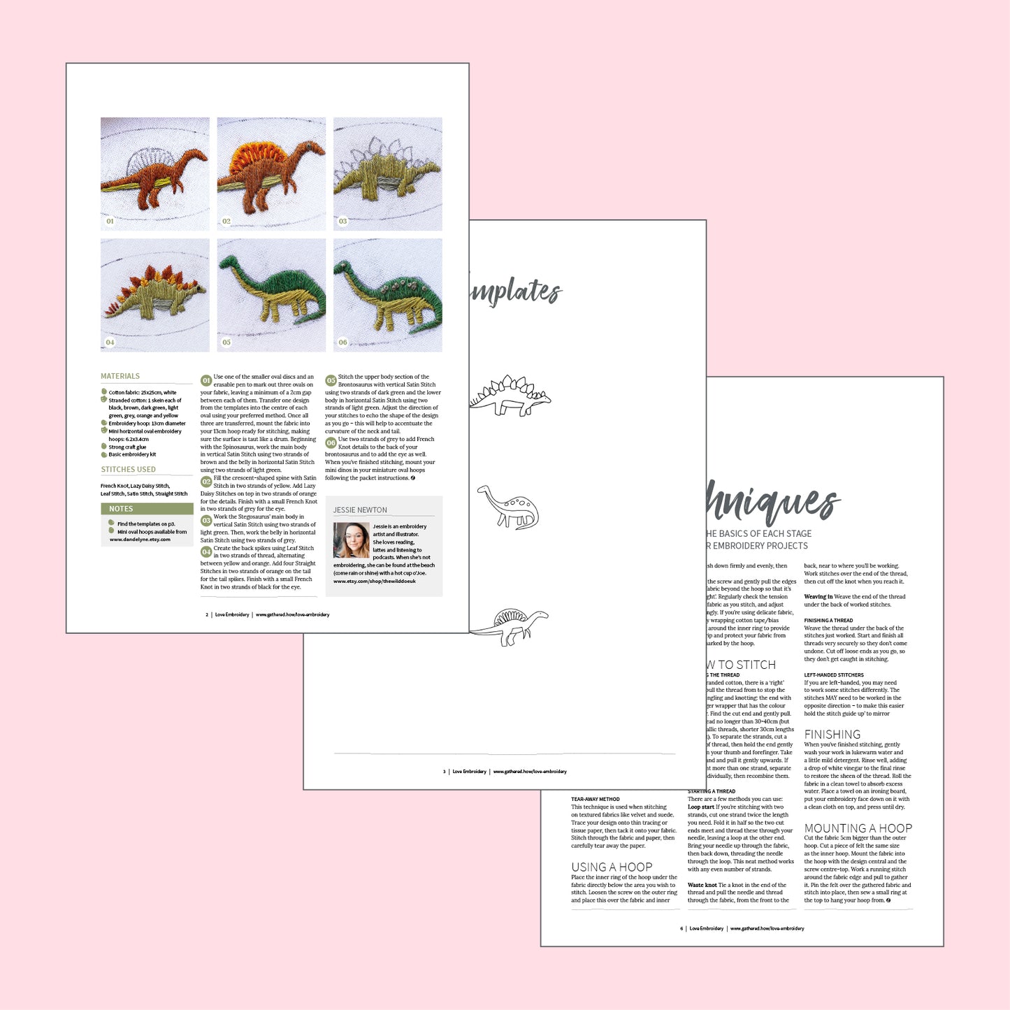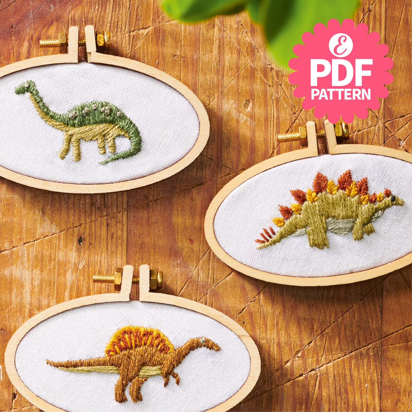 This beginner-friendly set of dino-themed patterns includes three designs for you to stitch - a Spinosaurus, Stegosaurus, and Brontosaurus - in teeny, tiny scale. Each can fit in the palm of your hand and can be created using just five essential stitches.