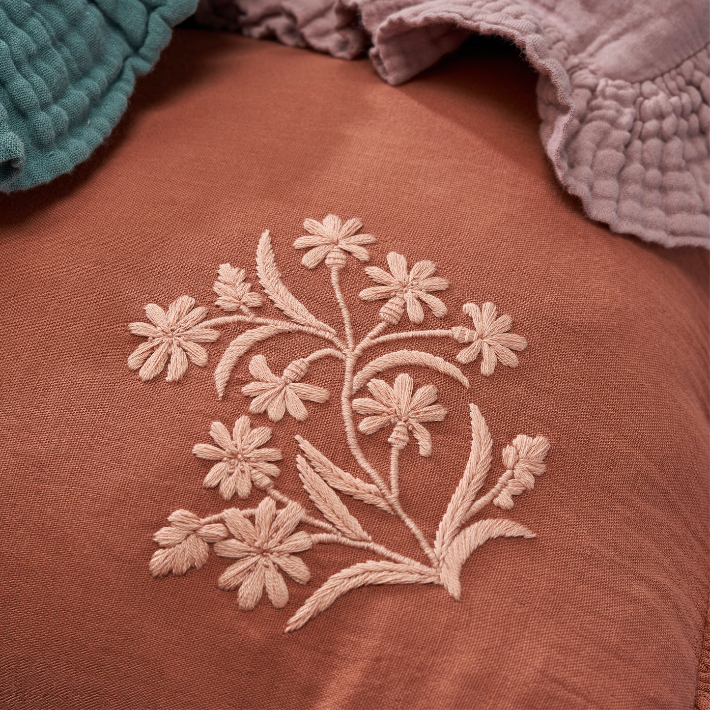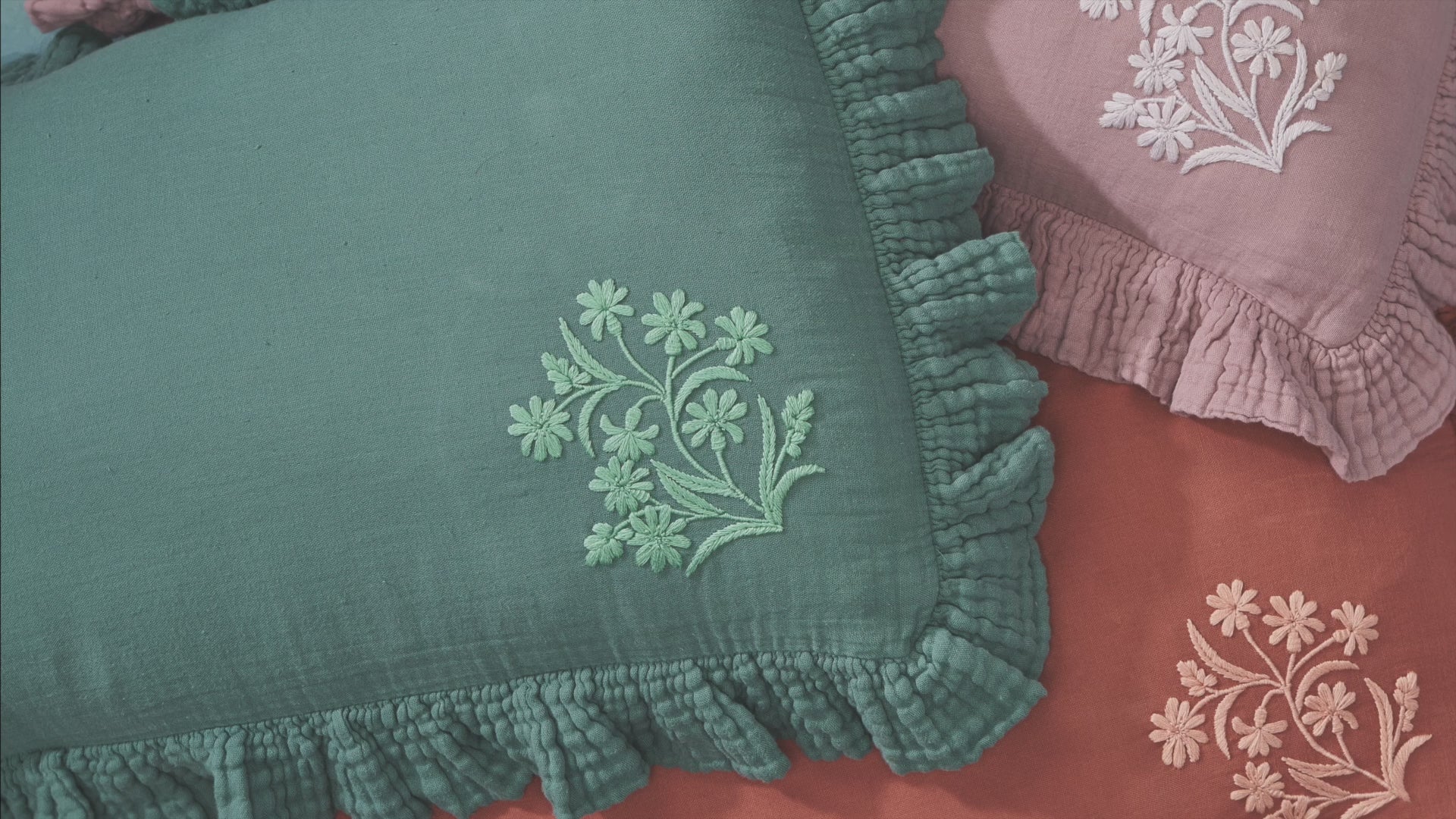 Work with muted hues to embellish stacks of plain, pre-made pillowcases with our pretty floral motif. This purse-friendly embroidery pattern allows you to add a personal touch to bedding, cushion covers, kitchen linens, clothing – and anything else you fancy – using just a handful of threads from your stash!