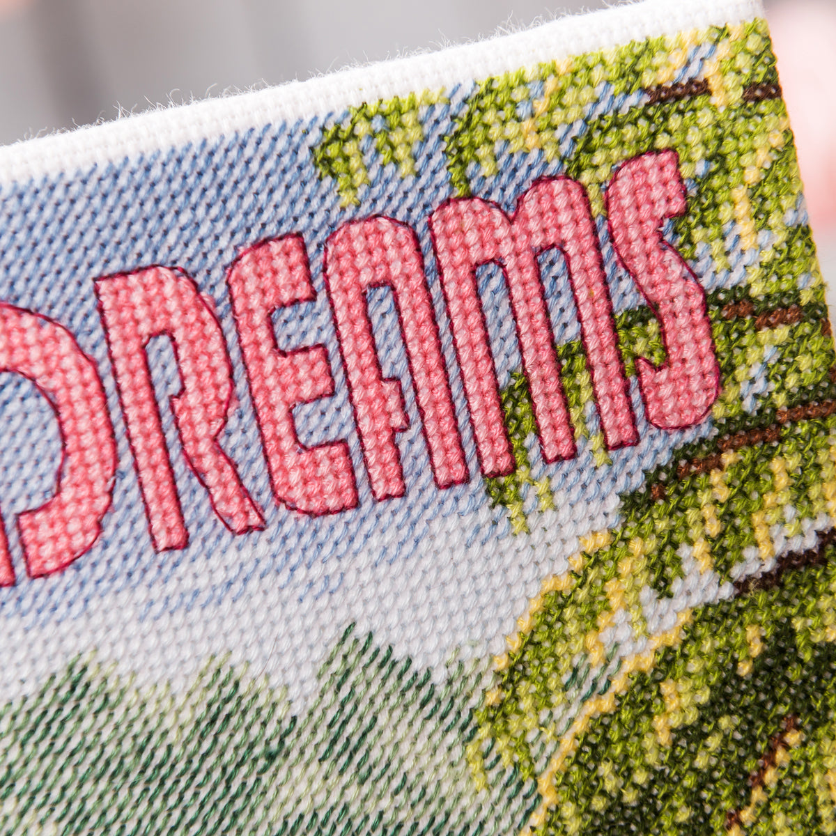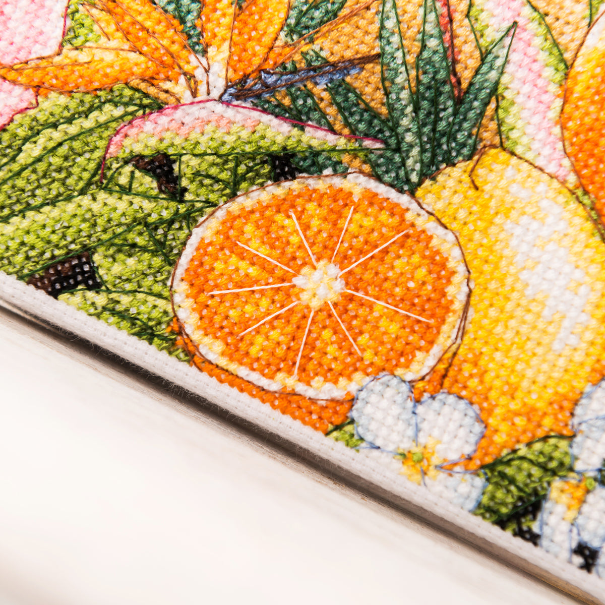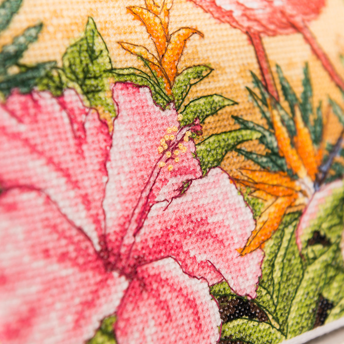 Stitch your own exotic beach escape and create a window into an alluring, picture-perfect tropical world with a pretty pink flamingo in a poster-style display.